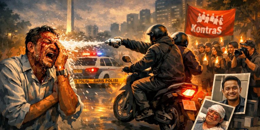 Gebrak.id melaporkan bahwa rekaman CCTV yang diputar di hadapan media dalam konferensi pers di YLBHI, Jumat 13 Maret 2026, mengungkap fakta yang semakin memperjelas bahwa ini adalah operasi yang terencana matang: dua terduga pelaku berboncengan sempat berputar balik sebelum melakukan aksinya, melintas melewati lokasi dekat Jembatan Talang, berhenti sejenak, lalu kembali melintas dan melakukan penyiraman.
